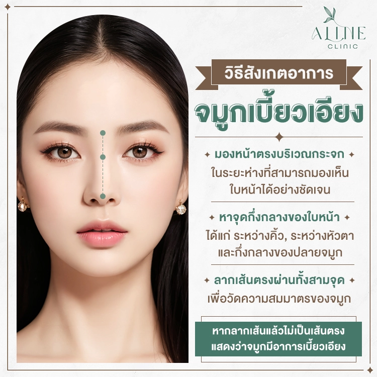 สามารถสังเกตได้จากการมองหน้าตรงผ่านกระจก โดยหาจุดกึ่งกลางของใบหน้า 3 จุด ได้แก่ ระหว่างคิ้ว, ระหว่างหัวตา และกึ่งกลางของปลายจมูก เพื่อใช้เป็นแนวเส้นแสดงความสมมาตรของจมูก หากลากเส้นผ่านทั้งสามจุดแล้วไม่เป็นเส้นตรง หรือมีการเอียงไปด้านใดด้านหนึ่งมากเป็นพิเศษ ไม่ว่าจะเป็นบริเวณสันจมูกหรือปลายจมูก แสดงว่าจมูกของคุณกำลังเบี้ยวเอียงอยู่นั่นเองค่ะ