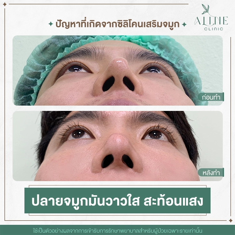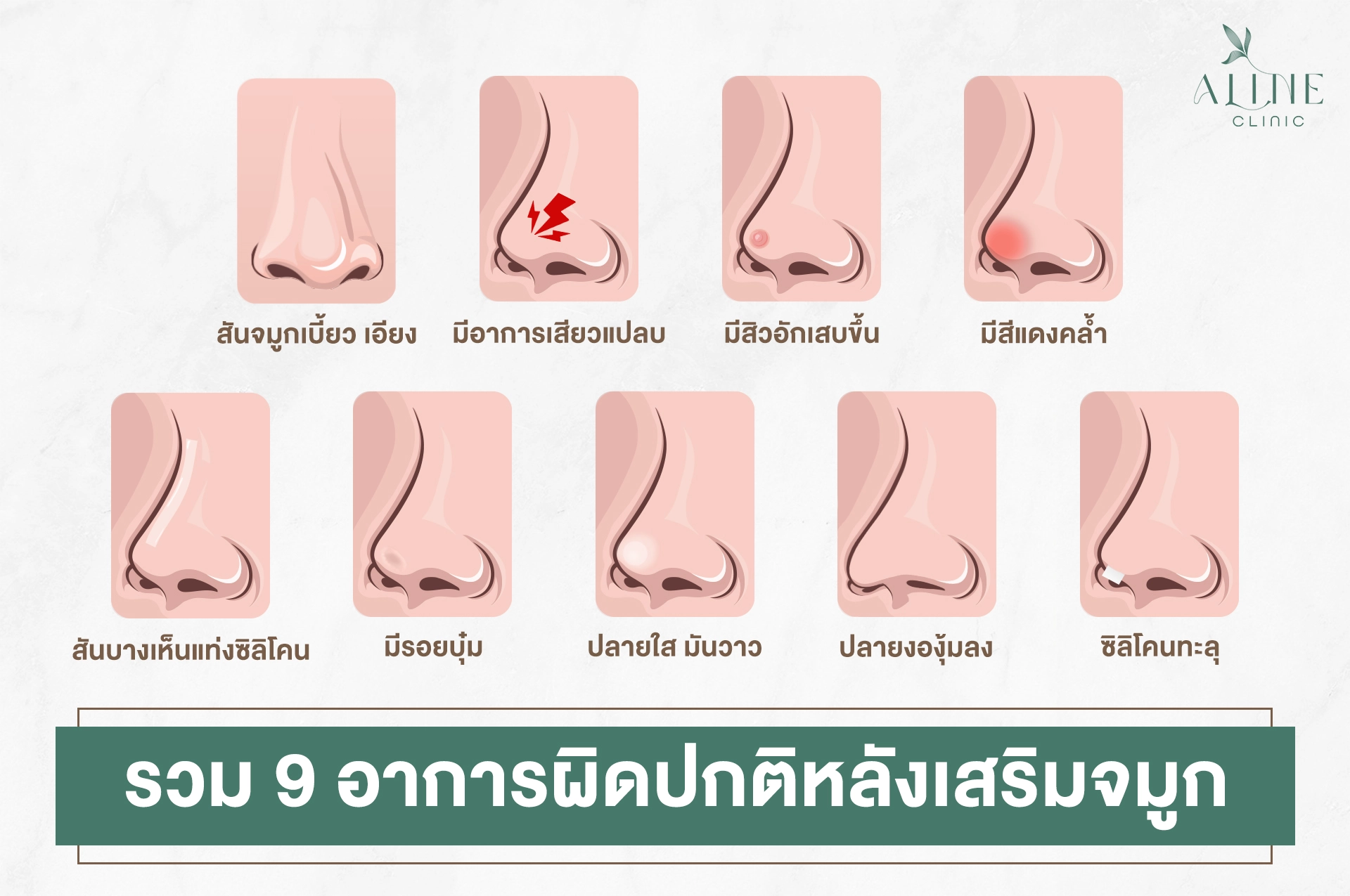 หากเสริมจมูกแล้วมีสิวอักเสบขึ้นบริเวณปลายจมูก โดยมีทั้งอาการปวด บวมแดงเป็น ๆ หาย ๆ ในบริเวณเดิม ๆ อย่าชะล่าใจไปนะคะน้องอลีนขอเตือน !! เพราะการเกิดสิวอักเสบที่ปลายจมูก อาจไม่ใช่แค่การเป็นสิวธรรมดา แต่อาจนำไปสู่การอักเสบติดเชื้อ โดยเชื้อสิวสามารถเข้าไปทำลายเนื้อเยื่อ ส่งผลให้เนื้อจมูกบางลงจนเห็นผิวของซิลิโคน และมีโอกาสที่ซิลิโคนจะดันเนื้อปลายจมูกจนทะลุได้เลยนะคะ