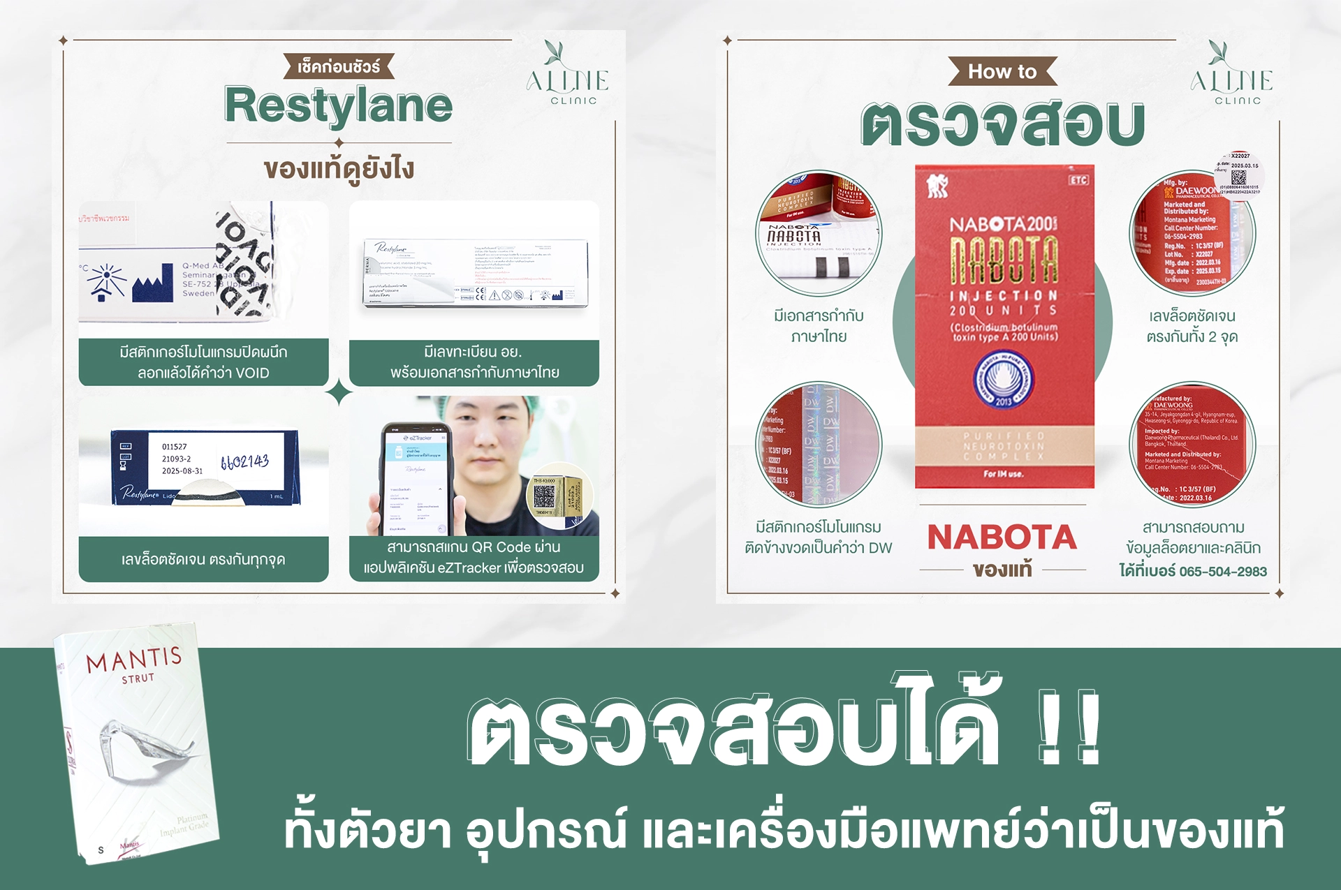 ต้องมั่นใจว่าตัวยา วัสดุทางการแพทย์ รวมทั้งอุปกรณ์ทางการแพทย์ที่คลินิกเลือกใช้เป็นของแท้ โดยคนไข้ต้องสามารถตรวจสอบได้ ทั้งซิลิโคน, ตัวยา และเครื่องมือแพทย์ต่าง ๆ ว่าเป็นของแท้และมีการสั่งซื้อถูกต้องจากผู้จำหน่ายจริงหรือไม่ เพื่อความปลอดภัยต่อตัวเราเองนะคะ
