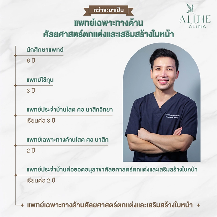 ทั้งหมดที่น้องอลีนได้นำมาแนะนำให้ทุกท่านได้รู้จักที่มาที่ไปของคุณหมอภูวิช คงชยะนันท์ จากแพทย์เฉพาะทางศัลยกรรมตกแต่งและเสริมสร้างใบหน้าสู่บทบาทใหม่ในฐานะเจ้าของอลีนคลินิก นอกจากประสบการณ์อันยาวนานในการผ่าตัดศัลยกรรมไข้มาอย่างยาวนานแล้ว คุณหมอภูวิชยังเป็นผู้ที่ให้คำปรึกษา อธิบายแนวทางในการรักษาคนไข้อย่างตรงไปตรงมาและใช้เวลาอย่างเต็มที่กับคนไข้ทุกเคสตั้งแต่วันปรึกษาก่อนการผ่าตัด เพื่อให้คนไข้มั่นใจว่าจะได้รับผลลัพธ์ที่ดีที่สุดและมีความปลอดภัยสูงสุด