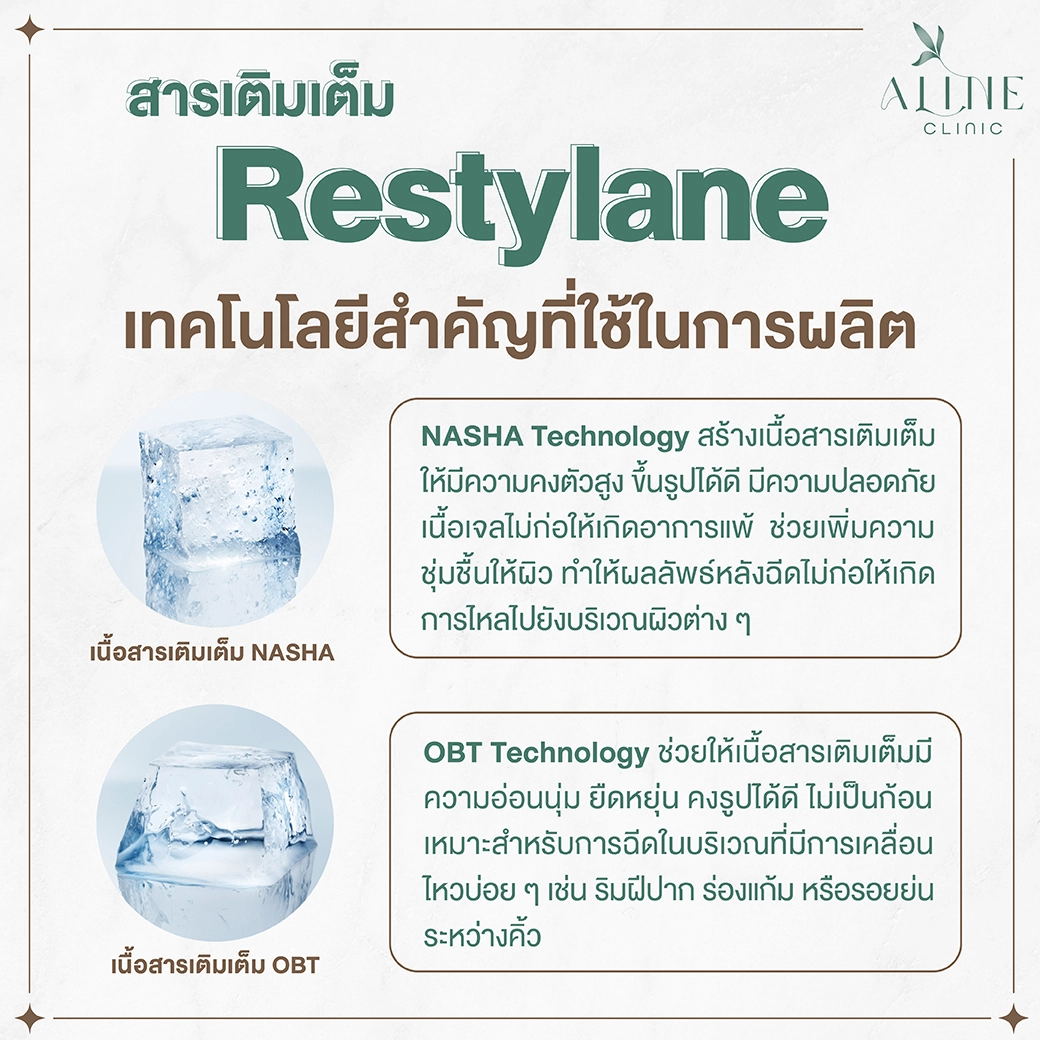 สารเติมเต็ม Restylane เป็นยี่ห้อที่มีคุณสมบัติที่โดดเด่นกว่าสารเติมเต็มยี่ห้ออื่น เพราะด้วยเทคโนโลยีลิขสิทธิ์เฉพาะ นั้นคือ NASHA Technology และ OBT Technology ซึ่งเป็นเทคโนโลยีที่ก้าวหน้า พัฒนาให้สารเติมเต็ม Restylane เหมาะสมกับการแก้ไขปัญหาบนใบหน้าเฉพาะจุด รวมถึงการลดความเสี่ยงที่จะเกิดอันตรายแก่คนไข้หลังฉีดอีกด้วย