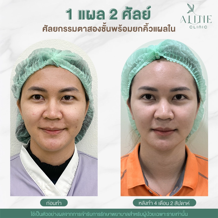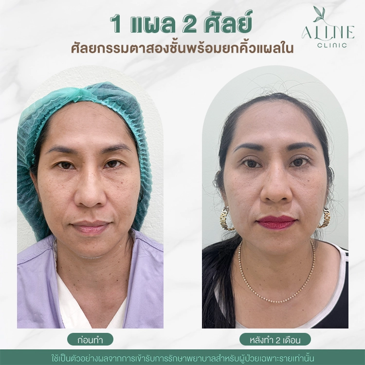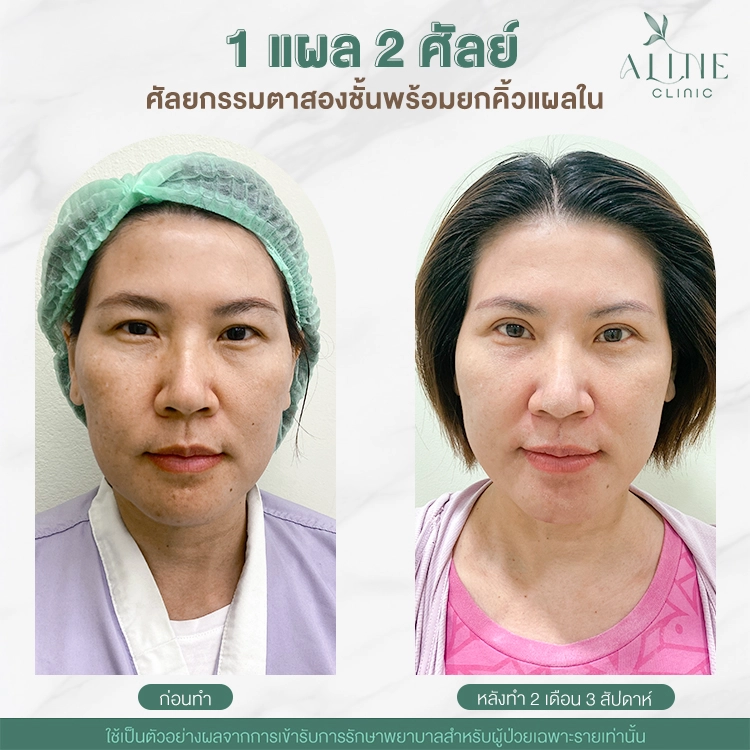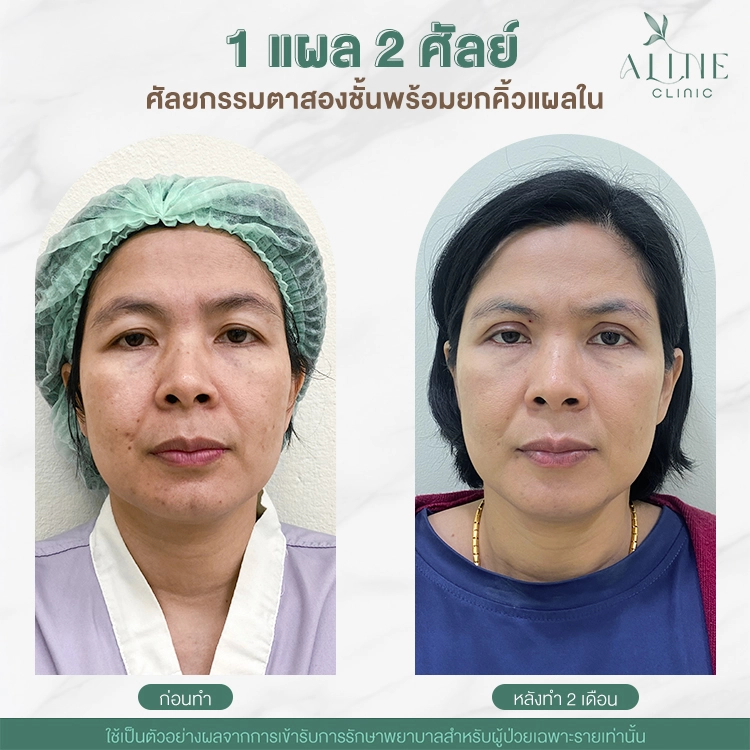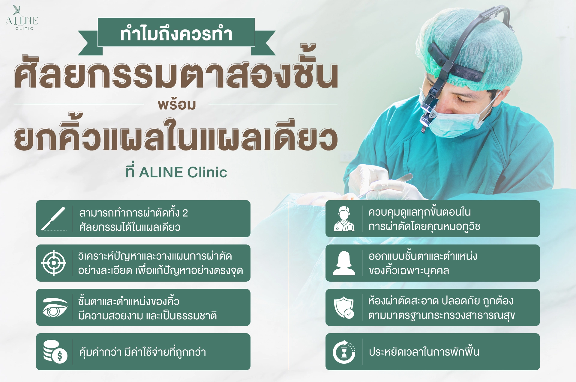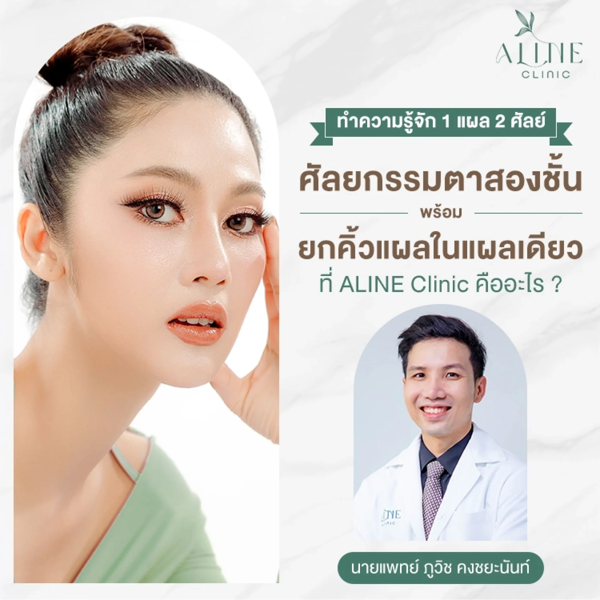 ในการทำศัลยกรรมแต่ละครั้ง การที่จะทำให้ได้ผลลัพธ์ที่ดีที่สุด อาจไม่สามารถแก้ปัญหาได้จากการเลือกทำศัลยกรรมเพียงอย่างเดียว แต่ก็คงไม่มีใครอยากผ่าตัดหลาย ๆ ครั้ง ต้องเสียค่าใช้จ่าย เสียเวลาในการเดินทาง เสียเวลาในการพักฟื้น เพราะฉะนั้น การทำศัลยกรรมตาสองชั้นพร้อมยกคิ้วแผลในแผลเดียวของคุณหมอภูวิช คงชยะนันท์ที่ ALINE Clinic จึงเป็นอีกหนึ่งการศัลยกรรมที่ได้รับความนิยมจากเหล่าคนไข้ของ ALINE Clinic เป็นอย่างมาก เพราะสามารถแก้ปัญหาได้อย่างตรงจุด เปิดแผลผ่าตัดเพียงจุดเดียว และยังช่วยให้ดวงตาและคิ้วสวยงามขึ้นอย่างเป็นธรรมชาติ มีความสมดุล และรับกับทั้งสองจุด