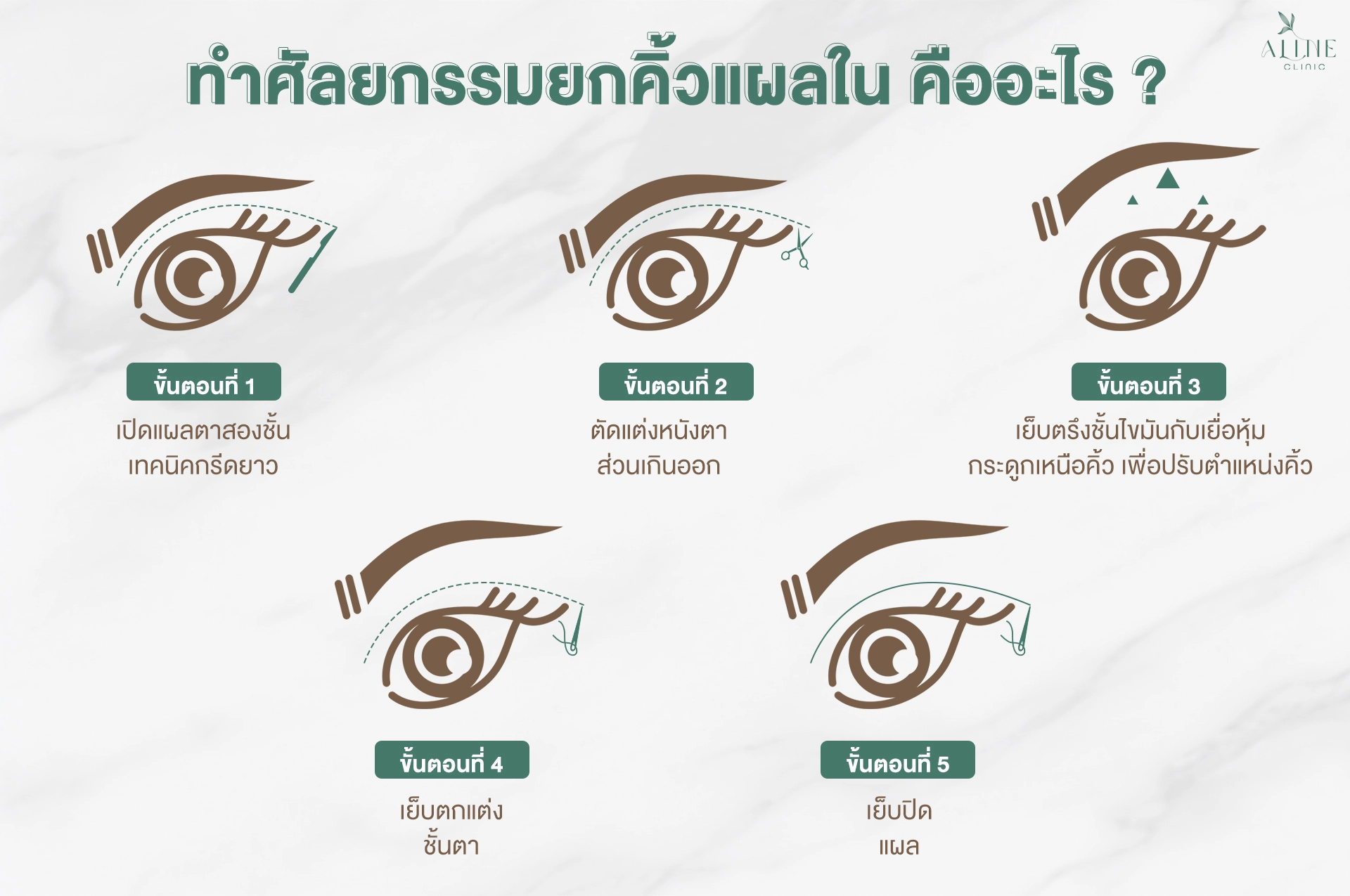 ศัลยกรรมยกคิ้วแผลใน คือ การผ่าตัดปรับระดับคิ้วให้มีตำแหน่งที่ถูกต้อง มีความเหมาะสม และเข้ากับใบหน้าของคนไข้ในแต่ละราย โดยจะช่วยแก้ปัญหาคิ้วตก หรือการที่มีพื้นที่ว่างระหว่างคิ้วและชั้นตาที่ไม่ได้สัดส่วน โดยคุณหมอภูวิชจะทำการผ่าตัดผ่านการเปิดแผลศัลยกรรมตาสองชั้นแบบกรีดยาว แล้วจึงทำการดึงไขมันชั้นใต้กล้ามเนื้อขึ้นไปตรึงกับเยื่อหุ้มกระดูกบริเวณเหนือคิ้ว พร้อมเย็บด้วยไหมทางการแพทย์ ทำให้คิ้วมีตำแหน่งที่อยู่สูงขึ้นกว่าเดิมนั่นเอง ผ่าตัดยกคิ้วจากด้านในจึงไม่มีแผลที่คิ้ว โดยทำร่วมกับการทำตาสองชั้น