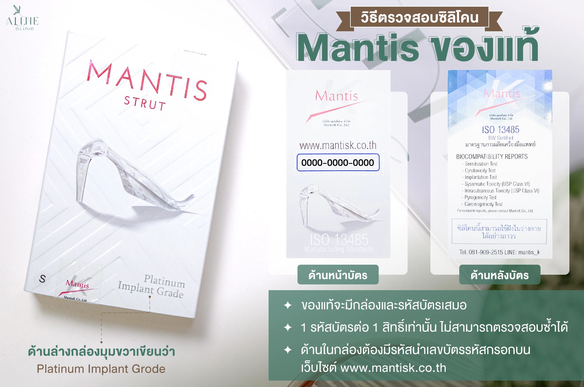 และที่สำคัญ เพื่อความสบายใจ และเป็นการยืนยันนั่งยันให้ทุกท่านได้มั่นใจว่าซิลิโคนที่คุณหมอภูวิชเลือกใช้ Mantis Strut Implant Silicone Mantis นั้นเป็นของแท้ มีการสั่งซื้ออย่างถูกต้องจากบริษัทฯ น้องอลีนขอนำการตรวจเช็กซิลิโคนจมูก Mantis ของแท้ ซึ่งที่ ALINE Clinic มอบกล่องซิลิโคนให้กลับบ้านทุกเคสเลยนะคะ โดยสามารถตรวจสอบยืนยันรหัสบัตรของแท้บนเว็บไซต์ http://www.mantisk.co.th ทั้งนี้ของแท้ต้องมีกล่องและรหัสบัตรเสมอ และที่สำคัญการตรวจสอบจะทำได้เพียง 1 รหัสบัตรต่อ 1 สิทธิ์เท่านั้นค่ะ ถ้ามีการตรวจซ้ำ แสดงว่าซิลิโคนตามรหัสบัตรนั้น ๆ ถูกนำไปใช้เรียบร้อยแล้ว แล้วซิลิโคนที่ใส่อยู่ในจมูกเราล่ะ !!? น้องอลีนไม่อยากจะคิดเลยนะคะ