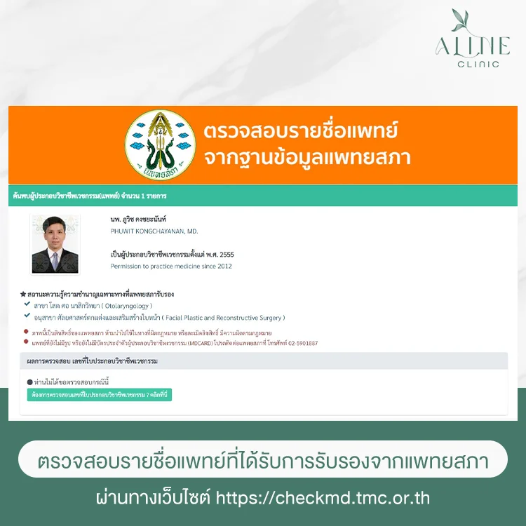 ตรวจสอบรายชื่อแพทย์ที่ได้รับการรับรองจากแพทยสภา ผ่านทางเว็บไซต์ https://checkmd.tmc.or.th