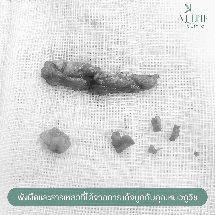หลังจากที่ได้พบกับคุณหมอภูวิช คุณหมอก็ได้ทำการนัดหมายให้เข้ามาประเมินปัญหา และวางแผนการแก้จมูกที่ ALINE Clinic ค่ะ ทำให้หลินได้รู้ว่าที่จมูกของหลินมีลักษณะงุ้มตกแบบนี้ ก็เป็นเพราะสารเหลวที่หลินเคยฉีดเมื่อครั้งเป็นวัยรุ่น ได้จับตัวแข็งเป็นก้อนและไหลลงมากองรวมกันอยู่บริเวณปลายจมูก ทำให้จมูกของหลินผิดรูปนั่นเองค่ะ อีกทั้งโครงสร้างภายในของหลิน ยังมีพังผืดเกาะอยู่อีกเป็นจำนวนมาก ในการแก้ไขจำเป็นต้องขูดเลาะพังผืดออกมาให้ได้มากที่สุด และคุณหมอต้องใช้ความปราณีตในการเลาะพังผืดอย่างสูง เพื่อไม่ให้ส่งผลกระทบต่อเนื้อเยื่อภายในจมูกให้น้อยที่สุด ในจุดนี้หลินขอชมเลยว่าคุณหมอภูวิชเก่งมากจริง ๆ ค่ะ เลาะพังผืดของหลินออกมาได้เป็นก้อนและเยอะมาก ๆ เลย