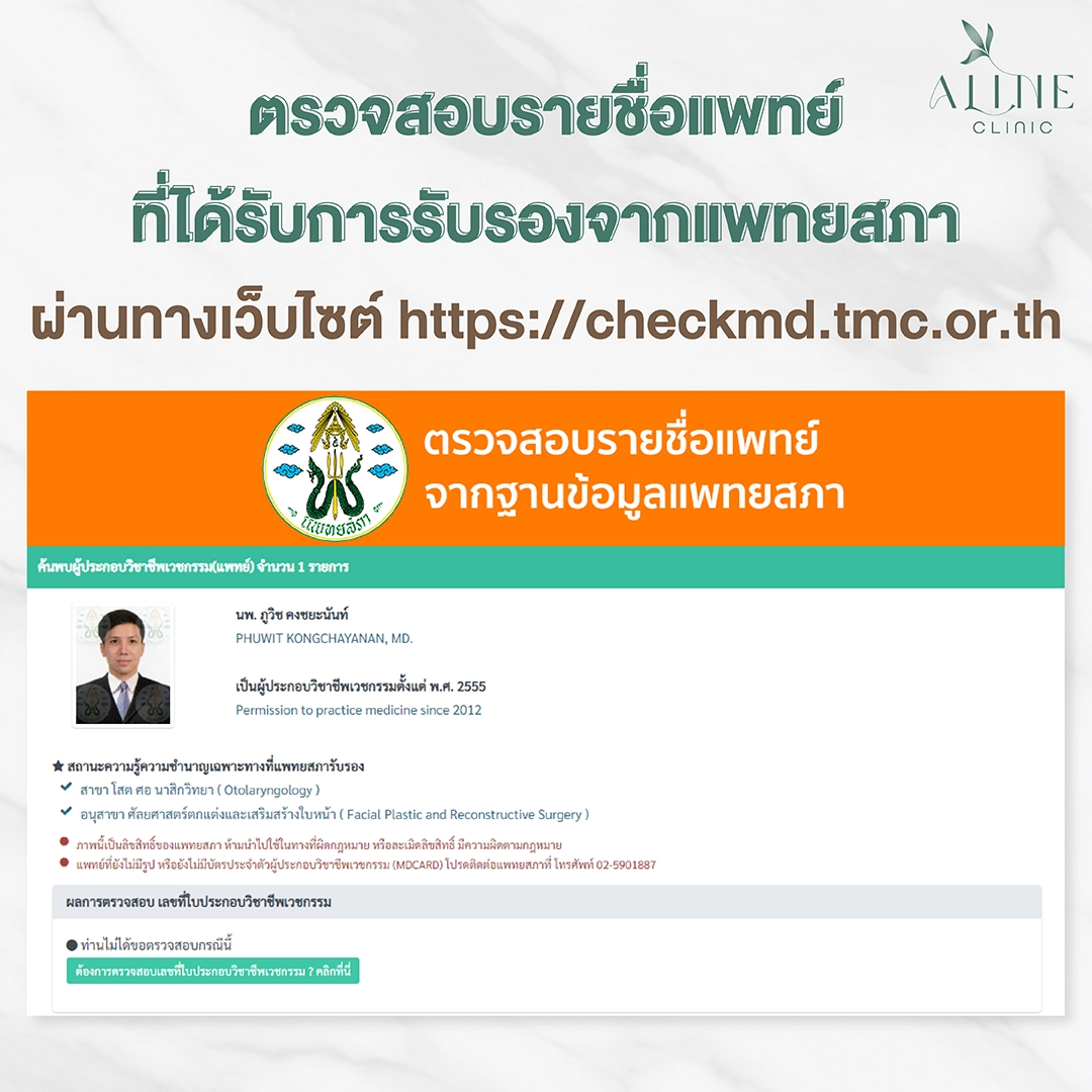 ป่านได้รู้จัก ALINE Clinic จากเฟซบุ๊คค่ะ ป่านก็เข้าไปดูรีวิวต่าง ๆ ป่านรู้สึกชอบรีวิวเสริมจมูกที่คุณหมอภูวิชทำมาก ๆ เลย แต่ป่านก็ยังไม่ได้ตัดสินใจเลือกทำจมูกที่ ALINE Clinic ทันทีเลยนะคะ ป่านได้นำชื่อคุณหมอภูวิชไปเสิร์จผ่านเว็บไซต์ของแพทย์สภา https://checkmd.tmc.or.th/ ด้วยค่ะ ทำให้ป่านได้รู้ว่าคุณหมอภูวิชจบแพทย์เฉพาะทางมาจากมหาวิทยาลัยชั้นนำของประเทศไทย และเป็นแพทย์เฉพาะทางด้านศัลยศาสตร์ตกแต่งและเสริมสร้างใบหน้าอีกด้วย และนี่ก็คือจุดเริ่มต้นที่ทำให้ป่านได้รู้จักกับคุณหมอภูวิช ที่ ALINE Clinic อย่างเป็นทางการค่ะ