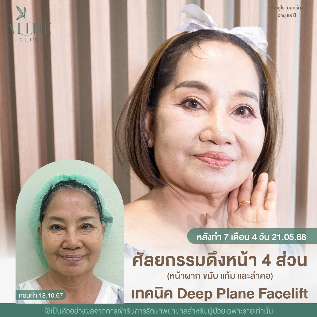 ทางแก้: การใช้เทคนิคที่ดึงชั้นลึกกว่า เช่น SMAS Facelift หรือ Deep Plane Facelift จะช่วยให้ผลลัพธ์อยู่ได้นานขึ้น 10-15 ปี
