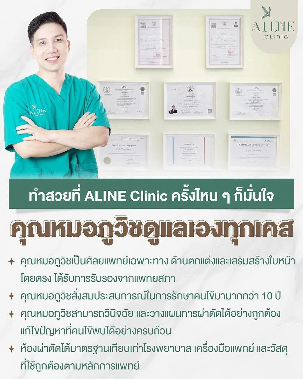 เหตุผลสำคัญอีกข้อที่ทำให้คุณเกอร์ตัดสินใจเลือก ALINE Clinic คือความเชื่อมั่นในฝีมือของ ภูวิช คงชยะนันท์ ศัลยแพทย์ตกแต่งใบหน้า ผู้เชี่ยวชาญด้านการผ่าตัดจมูกและแก้เคสโครงสร้างซับซ้อน คุณหมอภูวิชได้ให้คำปรึกษาอย่างละเอียด อธิบายทุกขั้นตอนของปัญหาเดิมและแนวทางแก้ไขที่เหมาะสมสำหรับเธอโดยเฉพาะ