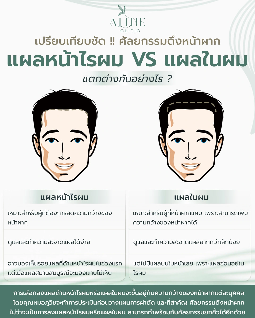 • ศัลยกรรมดึงหน้าผาก แผลหน้าไรผม เหมาะสำหรับผู้ที่ต้องการลดความกว้างของหน้าผาก การดูแลและทำความสะอาดแผลได้ง่าย อาจมองเห็นรอยแผลที่ด้านหน้าไรผมในช่วงแรก แต่เมื่อแผลสมานสมบูรณ์จะมองแทบไม่เห็น