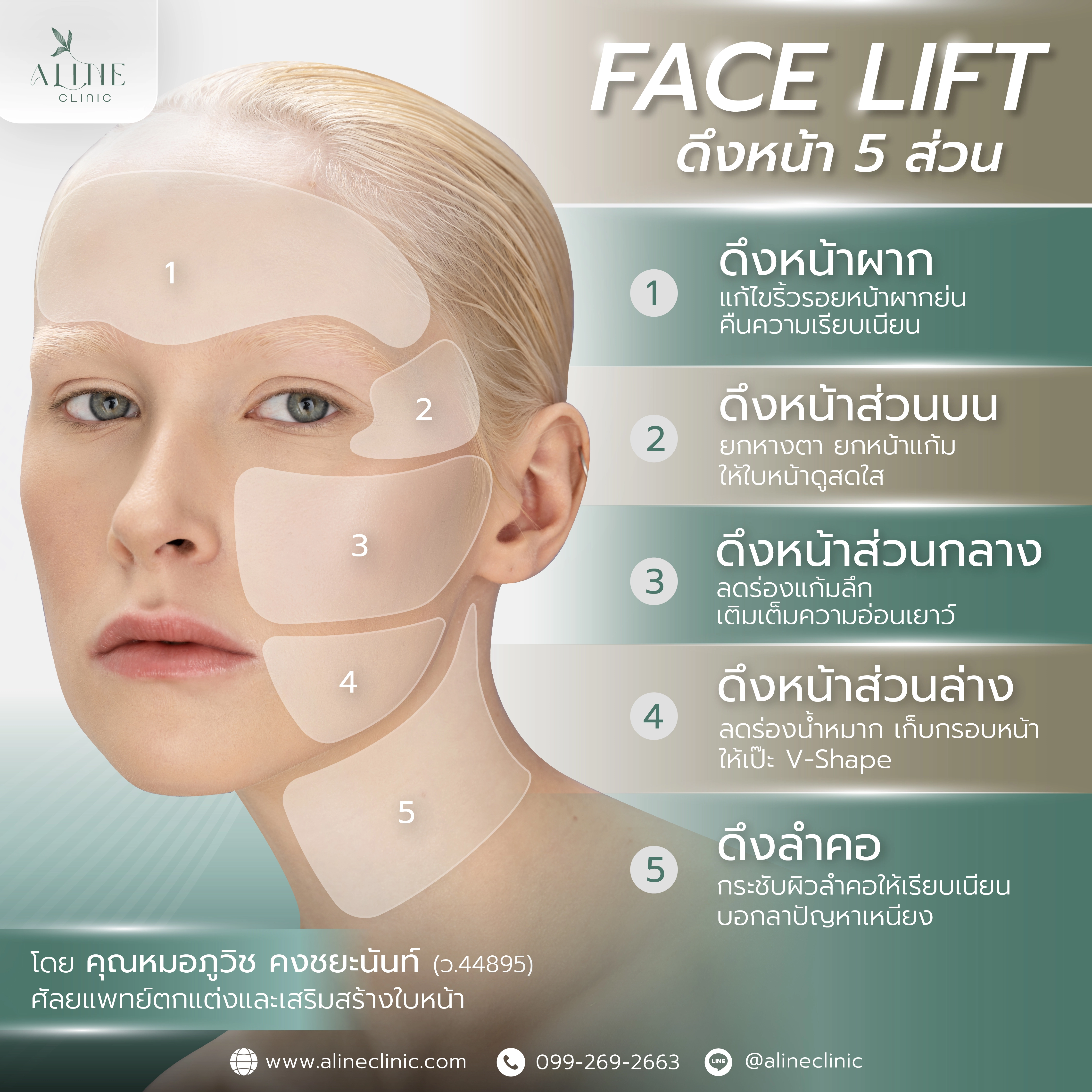 ที่ ALINE Clinic โคราช ดูแลทุกเคสดึงหน้าโดยคุณหมอภูวิช ศัลยแพทย์ตกแต่งและเสริมสร้างใบหน้าเฉพาะทาง ด้วยเทคนิคซ่อนแผลเนียนกริบ และแบ่งการดึงได้ถึง 5 ส่วน หย่อนส่วนไหน ดึงส่วนนั้น ปลอดภัย มาตรฐานระดับสากล