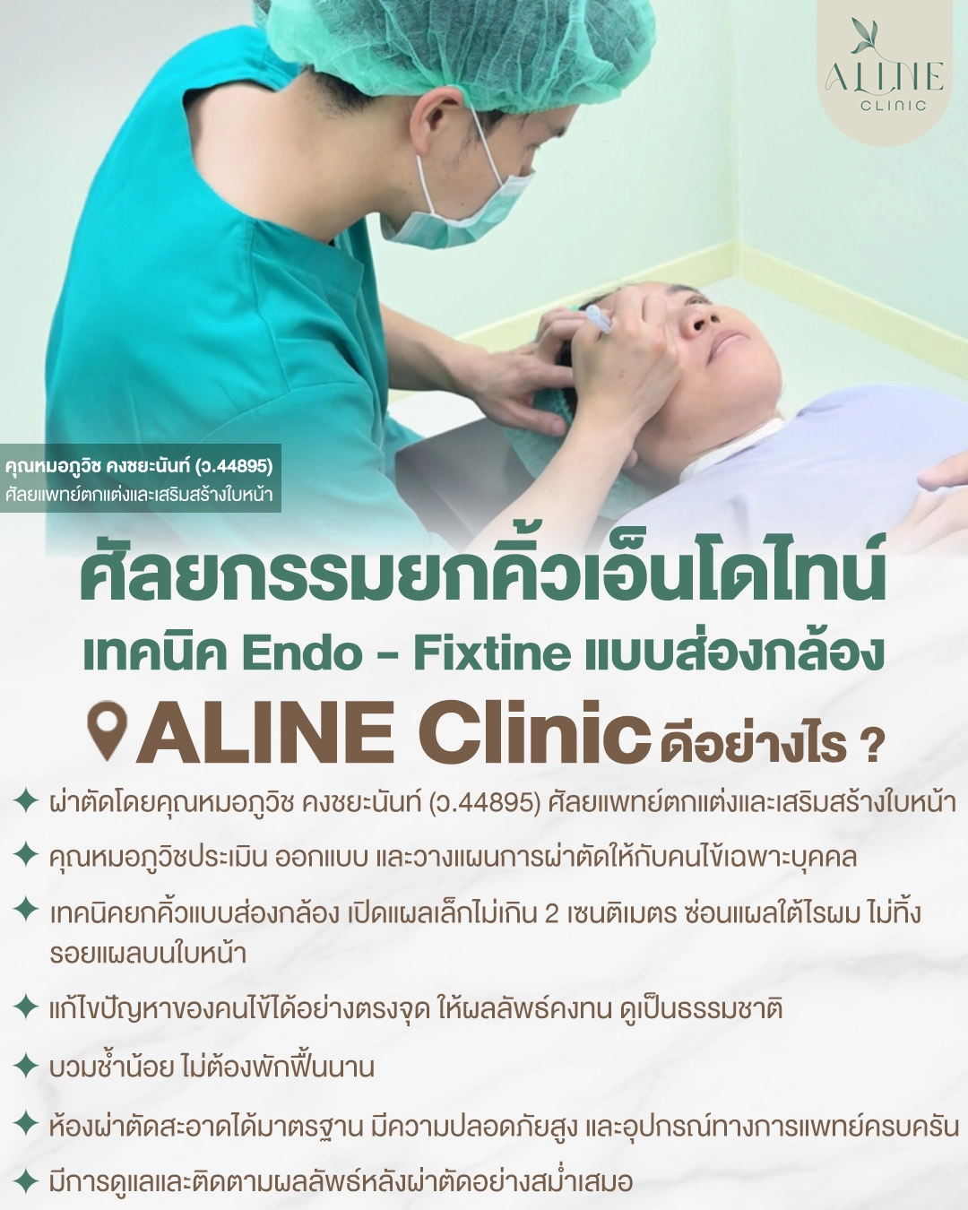 3. ศัลยกรรมยกคิ้ว (Brow Lift) หากคุณมีปัญหาความหย่อนคล้อยมาก หรือมีเนื้อกองทับชั้นตาชัดเจน การทำศัลยกรรมคือวิธี แก้คิ้วตก ที่แก้ปัญหาได้ลึกถึงโครงสร้าง ตรงจุด และให้ผลลัพธ์ที่ยาวนานที่สุด ที่ ALINE Clinic ภายใต้โปรแกรม Visionary Eyes เรามีเทคนิคการผ่าตัดที่ออกแบบมาเพื่อสรีระของแต่ละบุคคลโดยเฉพาะ ดูแลโดยคุณหมอภูวิช (ศัลยแพทย์ตกแต่งและเสริมสร้างใบหน้า) เช่น